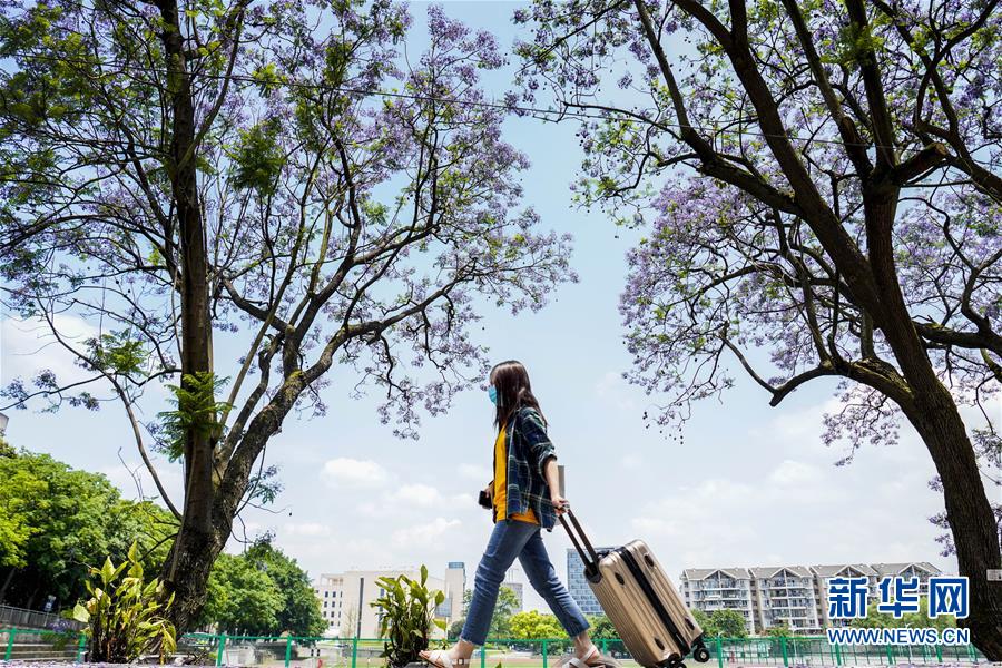 5月15日,西南大學(xué)校園內(nèi)的藍(lán)花楹樹(shù)下,一名學(xué)生拖著行李箱向宿舍走去。當(dāng)日,重慶西南大學(xué)迎來(lái)疫情以來(lái)首批返校大學(xué)生。據(jù)介紹,按照疫情防控的需要,重慶市高校2020年春季學(xué)期從5月11日起按照“一校一策”原則,實(shí)行錯(cuò)峰錯(cuò)時(shí)分批次有序開(kāi)學(xué)復(fù)課。新華社記者劉潺攝