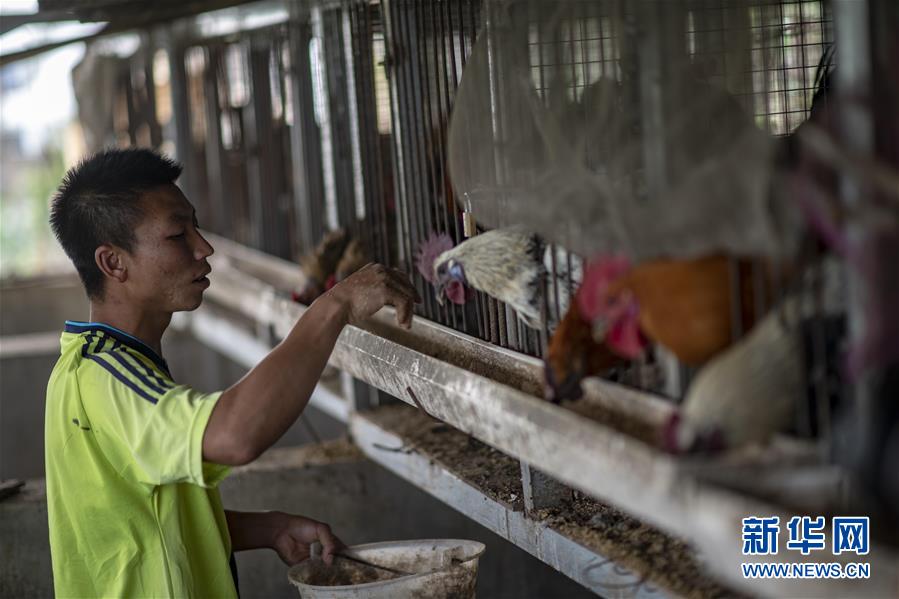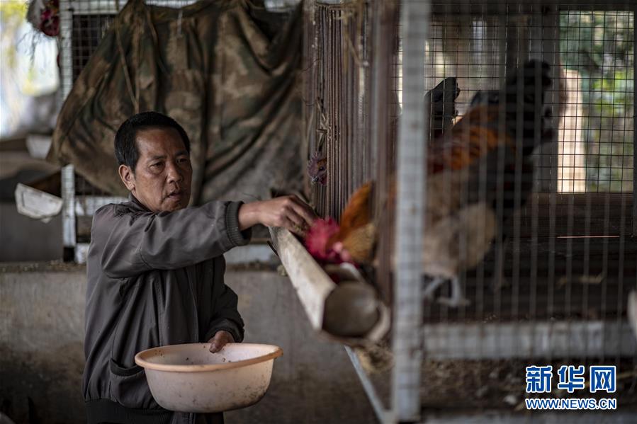 村民王九才在村里統(tǒng)一修建的雞舍里喂雞(3月28日攝)。新華社記者江文耀攝