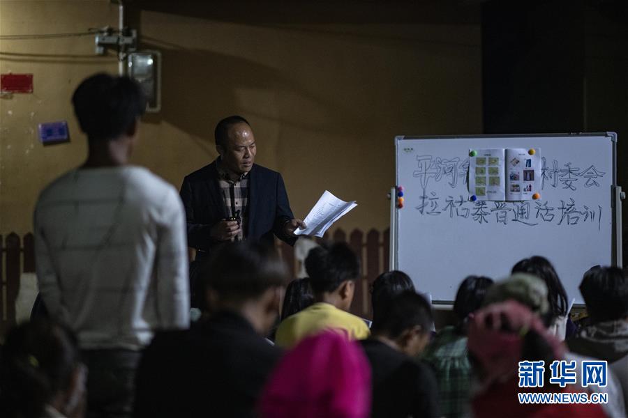 村民們利用夜間空閑時(shí)間,在院子里集體學(xué)習(xí)普通話(3月28日攝)。新華社記者江文耀攝