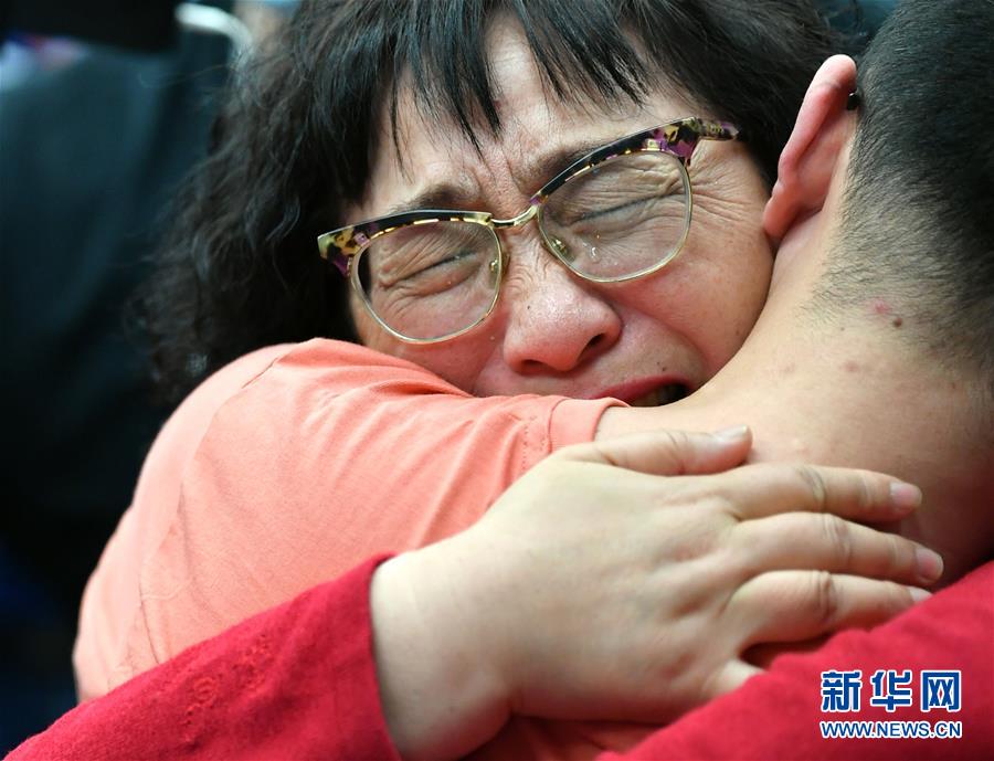 5月18日,李靜芝(左)與失散32年的兒子毛寅團(tuán)聚時(shí)落淚。新華社記者張博文攝