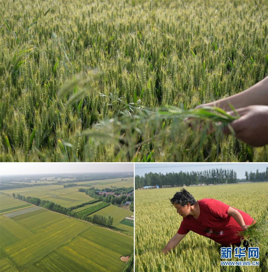這是一張拼版照片(圖片均為5月16日攝)。上圖、下右圖:在河南省開封市尉氏縣十八里鎮(zhèn)趙崗村,村民郭菊在麥田內(nèi)清除雜草。今年她家流轉(zhuǎn)土地種了18畝小麥,長勢良好。下左圖:尉氏縣十八里鎮(zhèn)趙崗村附近集中連片的麥田即將迎來收獲(無人機照片)。新華社記者孫清清攝