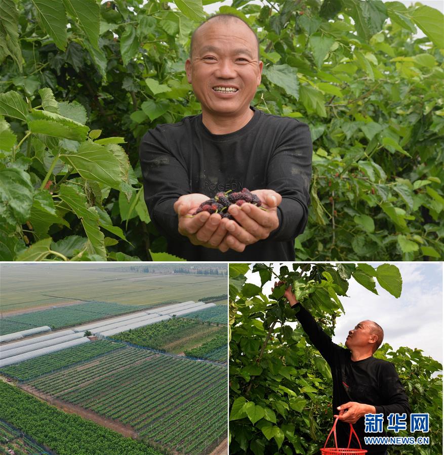 這是一張拼版照片(圖片均為5月16日攝)。上圖:河南省開封市尉氏縣大橋鄉(xiāng)十里鋪村村民孫根馬展示采摘的桑葚;下左圖:在扶貧政策扶持下,孫根馬流轉60多畝土地種植桑葚、葡萄、無花果等(無人機照片);下右圖:孫根馬在他經營的桑葚種植園內采摘桑葚。新華社記者孫清清攝