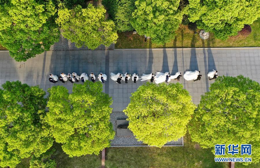 5月19日,新人們?cè)谂臄z婚紗照(無(wú)人機(jī)照片)。當(dāng)日,15對(duì)新人在江蘇南京集體拍攝婚紗照,并將參加5月20日在南京舉行的“今世緣白衣天使集體婚禮”。拍攝婚紗照的部分新人此前因馳援武漢或參加所在城市抗疫工作而推遲婚期。新華社記者季春鵬攝
