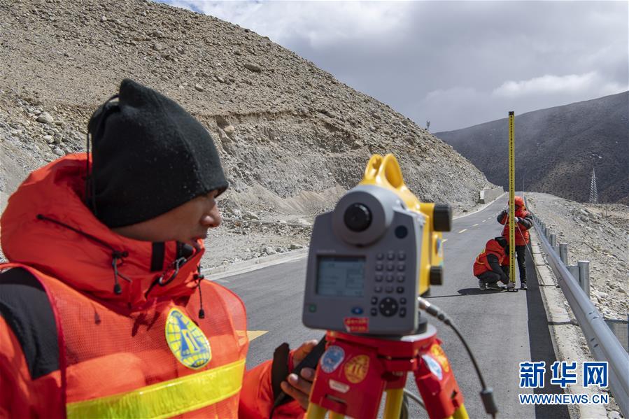 國測一大隊(duì)隊(duì)員在日喀則市定日縣曲當(dāng)鄉(xiāng)境內(nèi)進(jìn)行水準(zhǔn)測量(4月18日攝)。新華社記者孫非攝