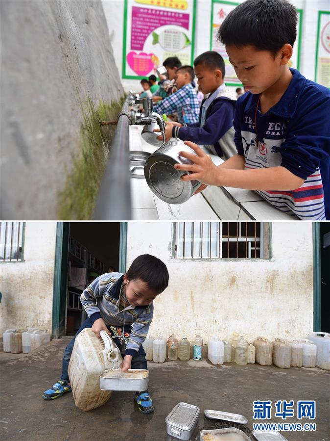 這是一張拼版照片。上圖:在大化瑤族自治縣板升鄉(xiāng)八好小學(xué),同學(xué)們?cè)谟萌赐耄?019年5月7日攝)。下圖:八好小學(xué)的同學(xué)們用儲(chǔ)備在水桶里的雨水淘米煮飯(2014年11月24日攝)。八好小學(xué)有400多名學(xué)生,曾僅有一個(gè)不足100立方米的水柜,用于收集儲(chǔ)存樓頂?shù)挠晁瑢W(xué)生需定期定量用水。遇到長(zhǎng)時(shí)間不下雨,學(xué)校需要到鄉(xiāng)政府所在地運(yùn)水。如今,學(xué)校修建了5個(gè)大水柜,并從兩公里外引泉水到校園,“飲水難”問(wèn)題得到解決。新華社記者黃孝邦攝