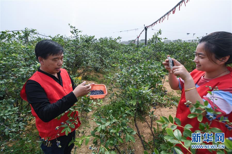 5月20日,長興縣林城鎮(zhèn)上獅村的藍莓種植幫扶基地內(nèi),青年志愿者與種植戶通過手機直播藍莓的采摘,并介紹當(dāng)?shù)厮{莓生長環(huán)境和品質(zhì),進行網(wǎng)上銷售。新華社記者徐昱攝