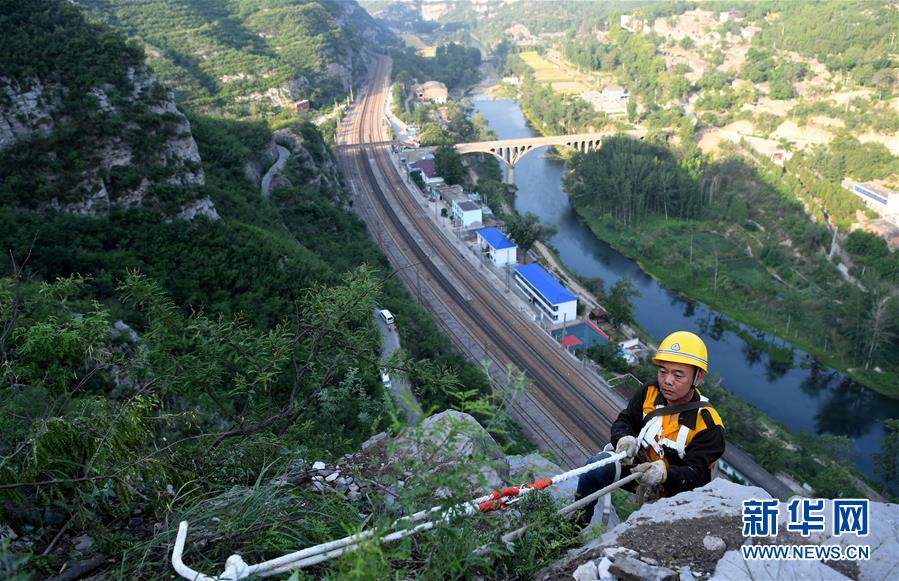 5月21日,捅山工胡軍從山頂垂降,準(zhǔn)備開始捅山作業(yè)。新華社記者郝源攝