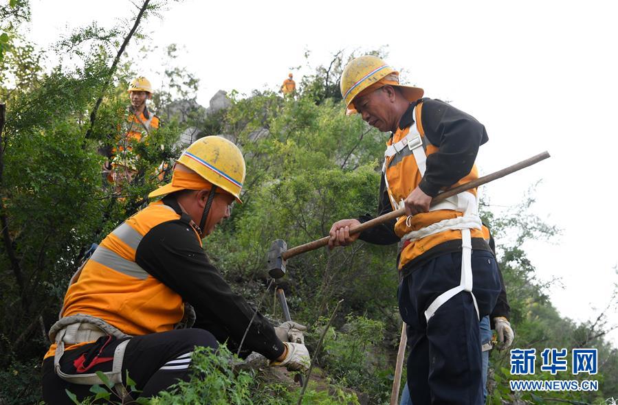 5月21日,捅山工在打安全樁。新華社記者郝源攝