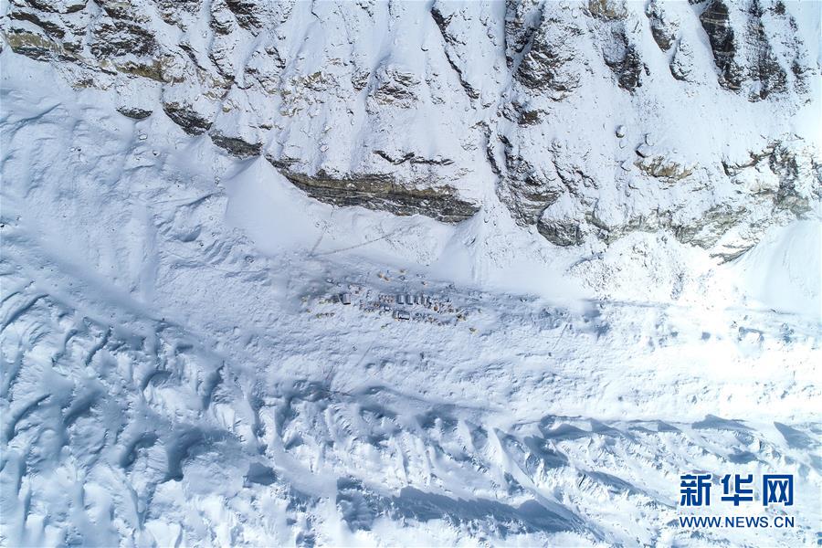 位于珠峰東絨布冰川旁海拔6500米的珠峰前進營地(5月22日攝,無人機照片)。