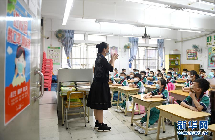 5月25日,廣州市荔灣區(qū)蔣光鼐紀念小學的老師在教學生防疫知識。當日,廣州市各小學一至三年級學生正式開學復課。至此,廣州市中小學各年級已全部開學復課。新華社記者盧漢欣攝