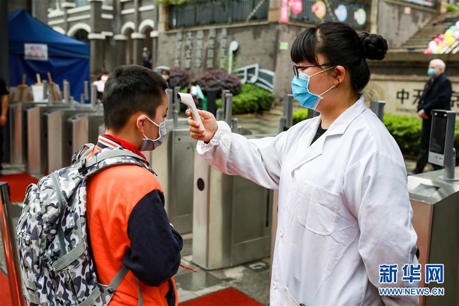 5月25日,貴陽市中天北京小學(xué)未來方舟校區(qū)學(xué)生在返校時(shí)進(jìn)行體溫檢測(cè)。新華社記者歐東衢攝