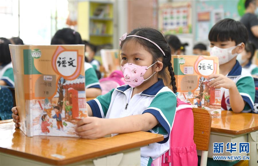 5月25日,廣州市荔灣區(qū)蔣光鼐紀念小學的學生在朗讀。當日,廣州市各小學一至三年級學生正式開學復課。至此,廣州市中小學各年級已全部開學復課。新華社記者盧漢欣攝