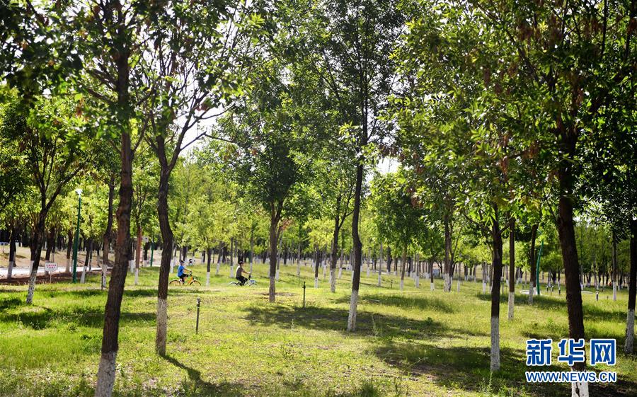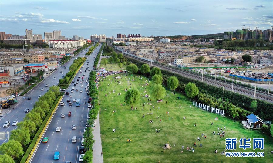 5月24日,市民在榆林市城市綠化帶休閑(無人機照片)。新華社記者陶明攝