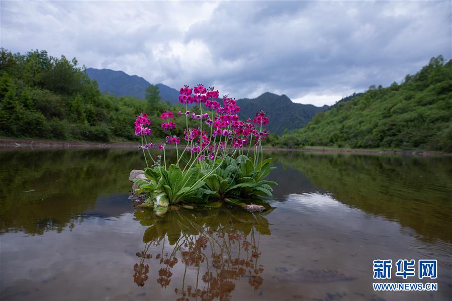 在四川省漢源縣桌子山,幾株報春花生長在水中(5月24日攝)。新華社記者江宏景攝