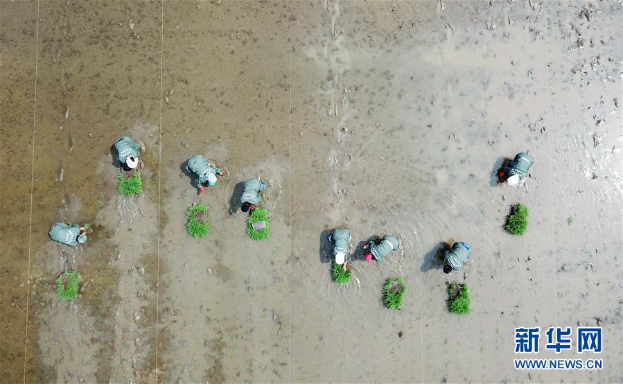 這是5月22日拍攝的農(nóng)民在寧安市渤海鎮(zhèn)上官地村一塊稻田中插秧(無人機(jī)照片)。新華社記者王建威攝