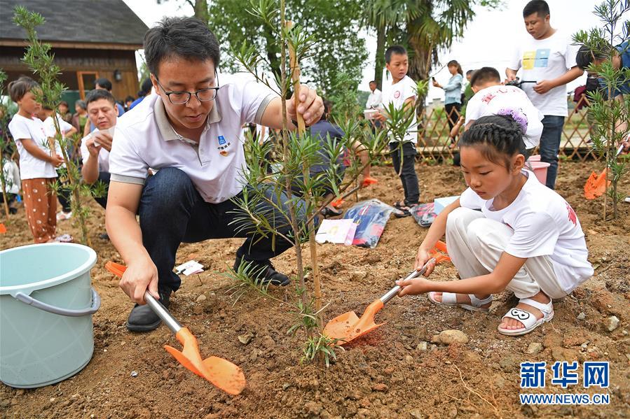 5月27日,在江西省貴溪市金屯鎮(zhèn)金屯村渡坊村小組,志愿者(左)和留守兒童一起種下“成長(zhǎng)樹”。