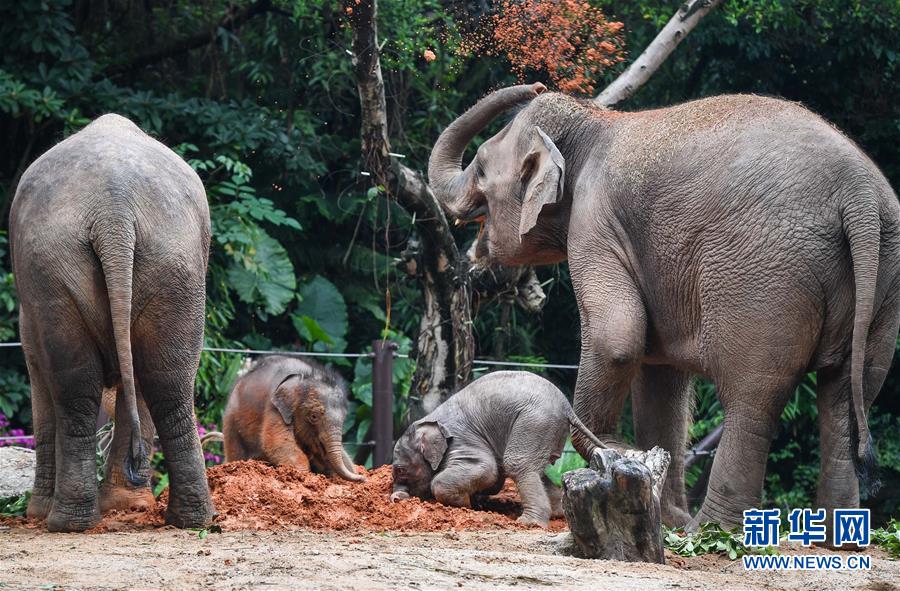 5月27日,廣州長隆亞洲象媽媽卷起紅泥撒在身上,這些泥土可以幫助大象護理皮膚和補充鹽分。新華社記者劉大偉攝