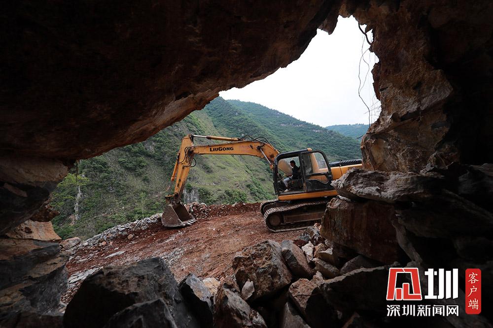 2020年5月27日,在貴州省畢節(jié)市納雍縣化作鄉(xiāng)雙巖頭村,挖掘機(jī)在觀音巖的懸崖邊修路。