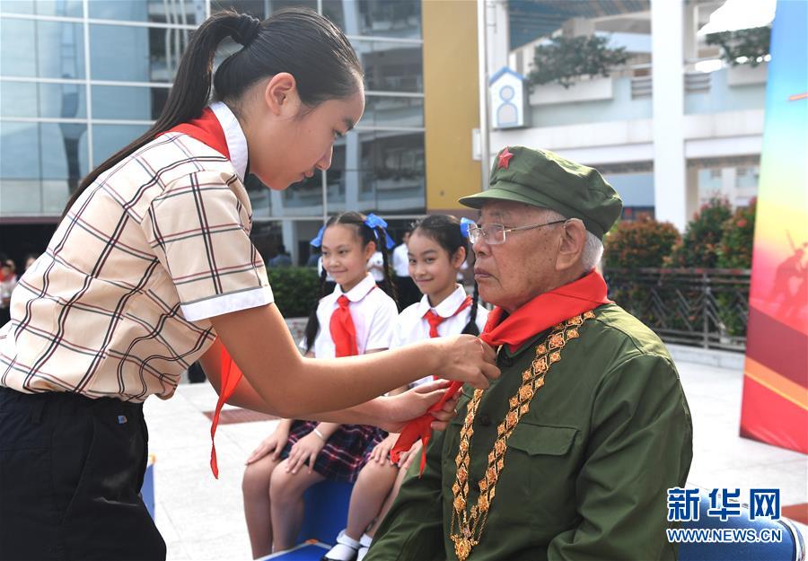 5月29日,少先隊(duì)員給李延年戴上紅領(lǐng)巾。“六一”國(guó)際兒童節(jié)來(lái)臨之際,“共和國(guó)勛章”獲得者、老一輩戰(zhàn)斗英雄李延年來(lái)到廣西南寧市濱湖路小學(xué)給孩子們講述戰(zhàn)爭(zhēng)年代的紅色故事,寄語(yǔ)他們好好學(xué)習(xí)、努力奮斗。孩子們向李延年贈(zèng)送了師生共繪的“紅色畫(huà)卷”,向老英雄致敬。新華社記者周華攝