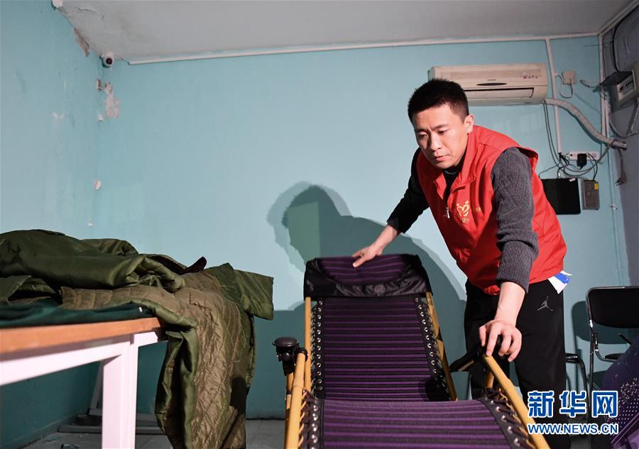 楊龍明在小區(qū)內(nèi)的值班室整理躺椅,到后半夜的時候只能在這里稍微休息一下(6月1日攝)。新華社記者李然攝。