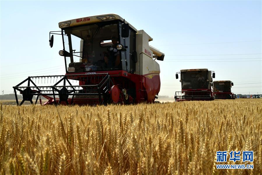 6月3日,在汶上縣郭倉(cāng)鎮(zhèn),收割機(jī)在收獲小麥。目前,我國(guó)第二大小麥主產(chǎn)區(qū)山東6000多萬(wàn)畝小麥進(jìn)入收獲階段。農(nóng)民們搶抓有利天氣,自南向北陸續(xù)開(kāi)鐮。新華社記者郭緒雷攝。