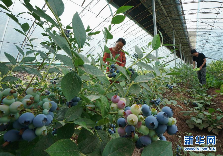 6月4日,唐山市豐潤區(qū)火石營鎮(zhèn)趙莊子村百草坡農產品農民專業(yè)合作社社員在生態(tài)農業(yè)園的大棚內采摘藍莓。新華社記者郭雅茹攝。