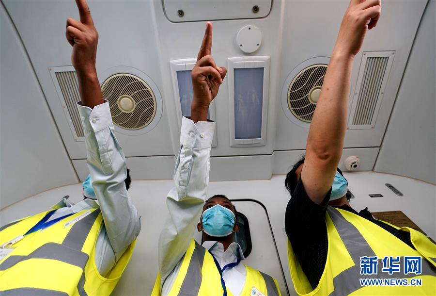 6月5日,實(shí)習(xí)指導(dǎo)教師帶領(lǐng)伊迪內(nèi)卡邱(中)和特瑞薩(左)練習(xí)標(biāo)準(zhǔn)化一次乘務(wù)作業(yè)。 新華社記者 李安 攝