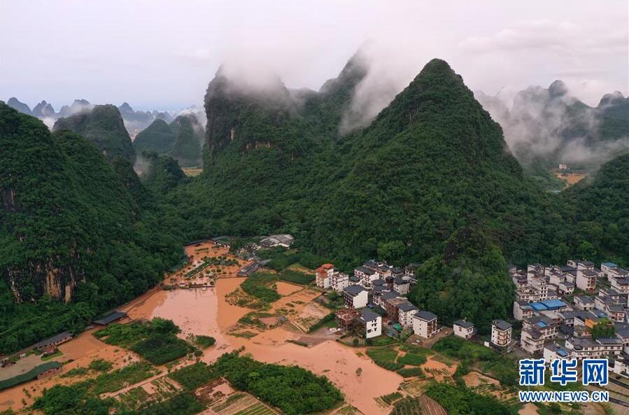 這是廣西陽(yáng)朔縣部分出現(xiàn)嚴(yán)重積水的村莊(6月7日攝,無(wú)人機(jī)照片)。新華社記者陸波岸攝
