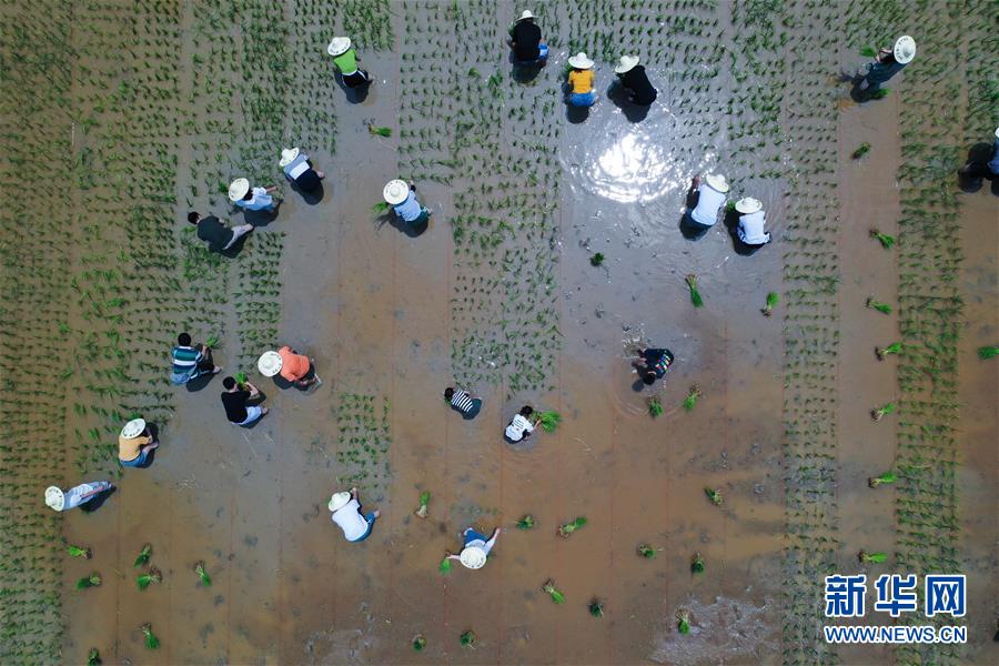 6月7日,孩子和家長們在體驗稻田插秧(無人機照片)。新華社記者徐昱攝