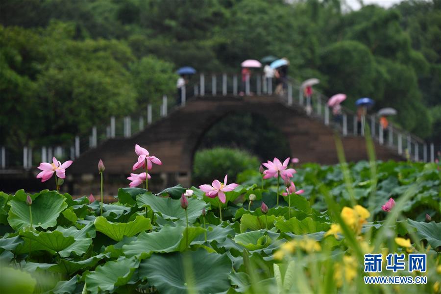 6月7日,一陣小雨過后,福州金山公園內(nèi)盛開的荷花愈加?jì)善G欲滴,吸引市民前來游覽。新華社記者姜克紅攝