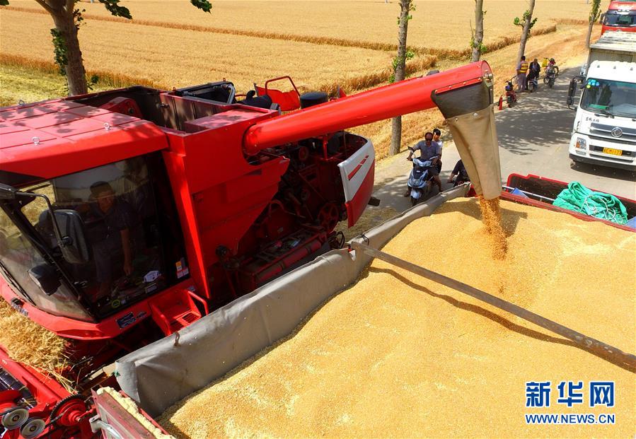 6月8日,在河北省南和縣閆里鄉(xiāng)閆里村,農(nóng)民將收獲的小麥裝車(無人機照片)?!叭摹逼陂g,河北省預計組織和調(diào)度小麥聯(lián)合收割機、拖拉機、夏玉米播種機等200萬臺農(nóng)業(yè)機械投入作業(yè)。新華社記者朱旭東攝
