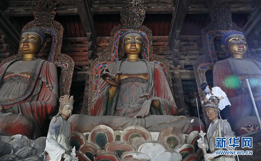 6月8日,工作人員對奉國寺的彩繪泥塑進行保護修復。新華社記者姚劍鋒攝