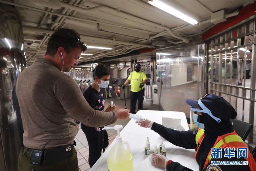 6月8日,在美國(guó)紐約,地鐵工作人員為乘客發(fā)放洗手液和口罩。在因新冠疫情進(jìn)入“居家令”近三個(gè)月之后,美國(guó)紐約市于當(dāng)?shù)貢r(shí)間8日開始“解封”,進(jìn)入經(jīng)濟(jì)重啟的第一階段。新華社記者王迎攝