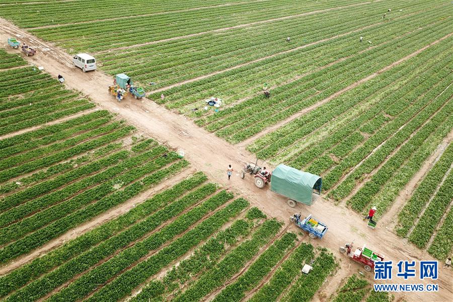 6月8日,粵港澳大灣區(qū)“菜籃子”(金昌)生產(chǎn)基地工作人員在采摘蔬菜(無人機(jī)照片)。盛夏漸近,位于甘肅省金昌市金川區(qū)的粵港澳大灣區(qū)“菜籃子”(金昌)生產(chǎn)基地的多種蔬菜陸續(xù)豐收。該基地種植面積達(dá)1.3萬多畝,采用高效噴灌、精量播種等技術(shù),以及“企業(yè)+合作社+基地+農(nóng)戶”的模式,通過輪作倒茬、循環(huán)供應(yīng)的方式,每年可種植蔬菜3至4茬,畝均產(chǎn)量2000公斤左右,總產(chǎn)值達(dá)1.5億元。新華社記者范培珅攝