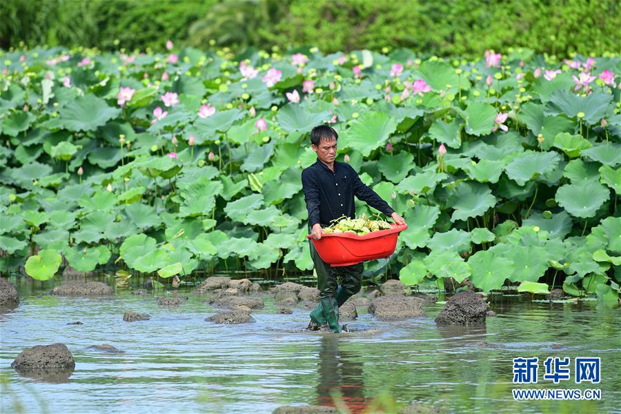 6月9日,村民在海口龍華區(qū)龍泉鎮(zhèn)美仁坡村采摘蓮蓬。初夏時節(jié),位于海南??邶埲A區(qū)龍泉鎮(zhèn)的蓮蓬逐漸成熟,當(dāng)?shù)卮迕窦泳o采摘,一派繁忙景象。新華社記者蒲曉旭攝