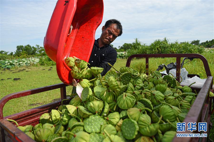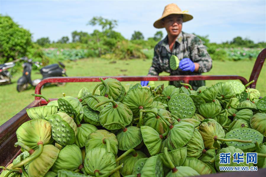 6月9日,村民在??邶埲A區(qū)龍泉鎮(zhèn)椰子頭村裝運采摘的蓮蓬。初夏時節(jié),位于海南??邶埲A區(qū)龍泉鎮(zhèn)的蓮蓬逐漸成熟,當(dāng)?shù)卮迕窦泳o采摘,一派繁忙景象。新華社記者蒲曉旭攝