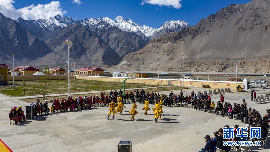 新疆塔什庫爾干塔吉克自治縣文工團演員在熱斯喀木村為村民演出(6月6日攝,無人機照片)。