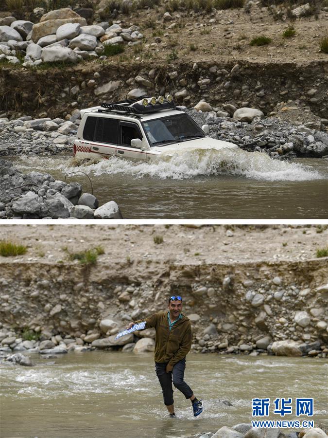 拼版照片:上圖為新疆塔什庫爾干塔吉克自治縣文工團的車輛通過一處涉水路段,前往熱斯喀木村演出;下圖為一名文工團演員從水里撿起車輛過河時被沖掉的車牌(6月5日攝)。新華社記者胡虎虎攝