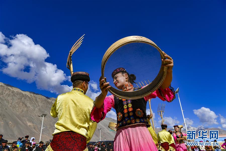 在熱斯喀木村,新疆塔什庫爾干塔吉克自治縣文工團演員(左)與村民一起跳舞(6月6日攝)。新華社記者胡虎虎攝