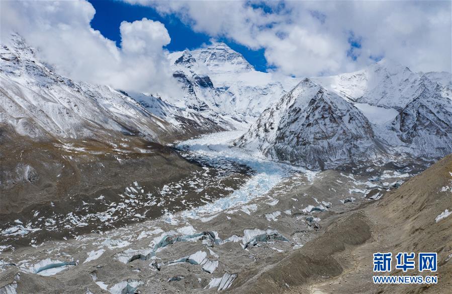 這是珠峰腳下的絨布冰川(無人機(jī)照片,4月30日攝)。從空中俯瞰珠穆朗瑪峰北坡,生機(jī)勃勃的高原濕地、蜿蜒曲折的盤山公路、壯麗秀美的絨布冰川,還有安靜的村莊和熱鬧的登山營地,共同構(gòu)成一幅壯美畫卷。新華社記者普布扎西攝