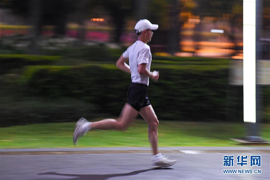 一位市民在海口萬(wàn)綠園夜跑(5月15日拍攝)。近年來(lái),夜跑成為越來(lái)越多都市人熱衷的健身方式之一。在海南??冢慨?dāng)夜幕降臨,“夜跑族”來(lái)到??谌f(wàn)綠園、世紀(jì)公園等夜跑場(chǎng)所跑步,用一身酣暢淋漓的汗水?dāng)[脫白天工作中的壓力,享受跑步帶來(lái)的歡愉。新華社記者 蒲曉旭 攝