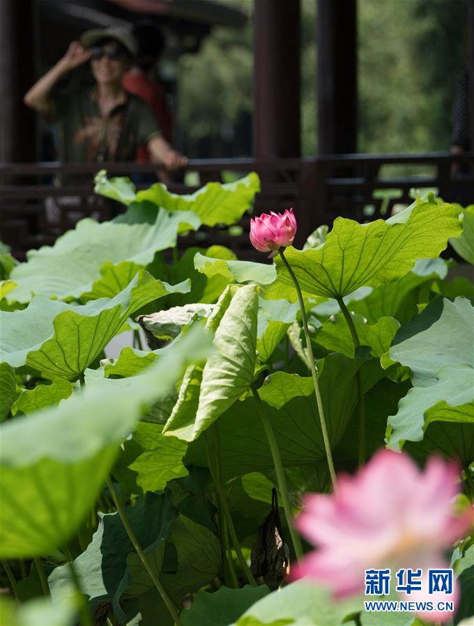 6月12日,游人在西湖曲院風(fēng)荷留影。隨著氣溫升高,杭州西湖荷花次第開放,引得游人駐足。新華社記者 翁忻旸 攝