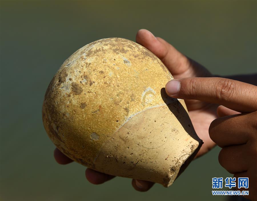 6月14日,在山東小清河章丘段考古發(fā)掘現(xiàn)場,考古工作者展示出土的瓷瓶。近日,濟南市考古研究所考古工作隊在對小清河章丘段進行考古調(diào)查和勘探時,發(fā)現(xiàn)了13座年代集中在北朝末期至唐朝初期的古墓。新華社記者 王凱 攝