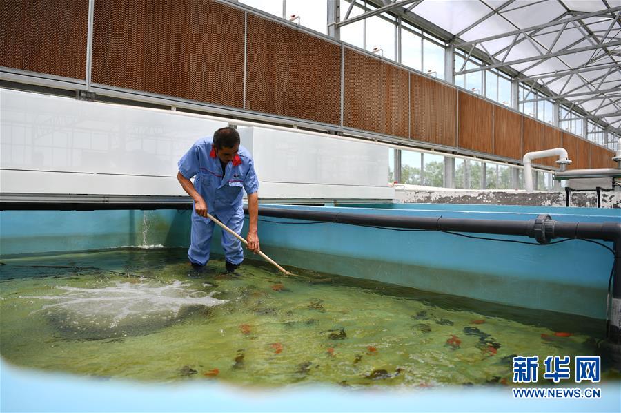 在天津現(xiàn)代晨輝科技集團(tuán)有限公司的養(yǎng)殖示范場,工人在清潔魚池(6月15日攝)。新華社記者 李然 攝