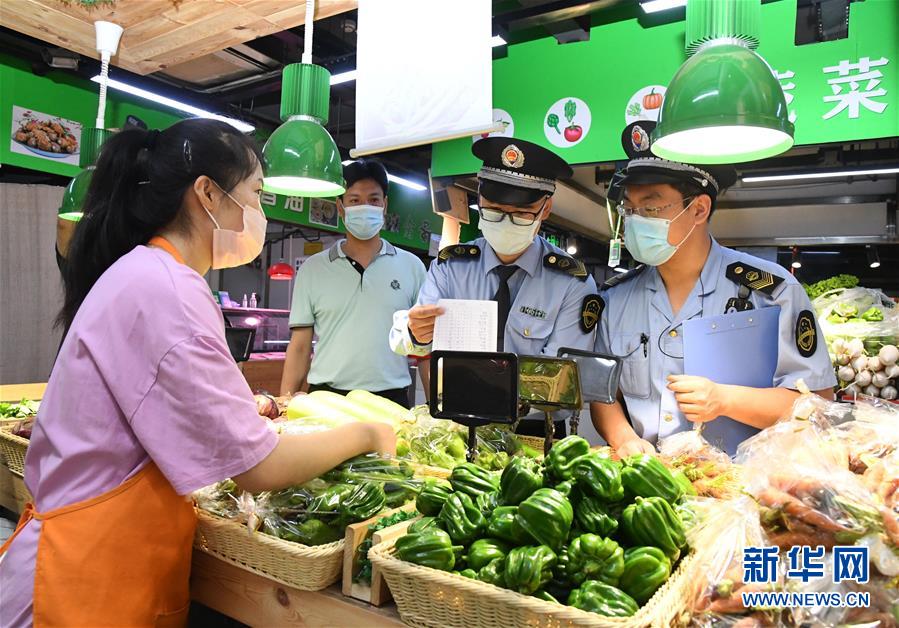 6月17日,在位于北京市海淀區(qū)的增光鴻運市場,執(zhí)法人員對商戶所售蔬菜的進貨渠道進行檢查。新華社記者 任超 攝