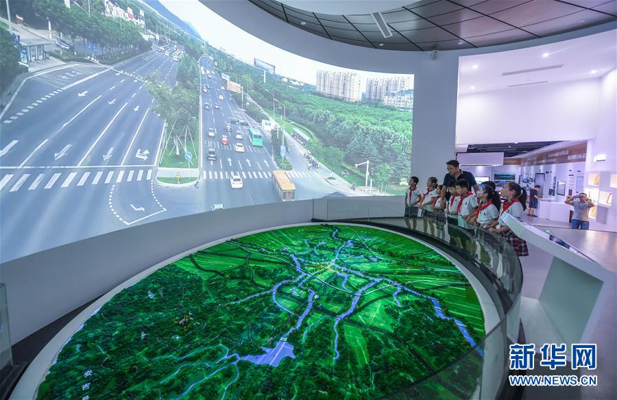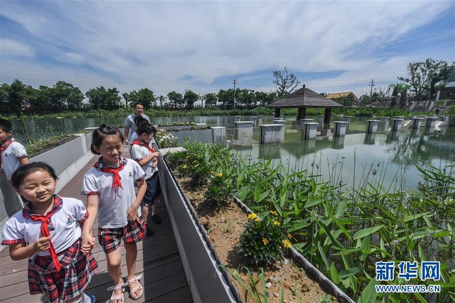 6月17日,洛舍鎮(zhèn)中心學(xué)校的師生們參觀水情館的室外園區(qū)。新華社記者 徐昱 攝