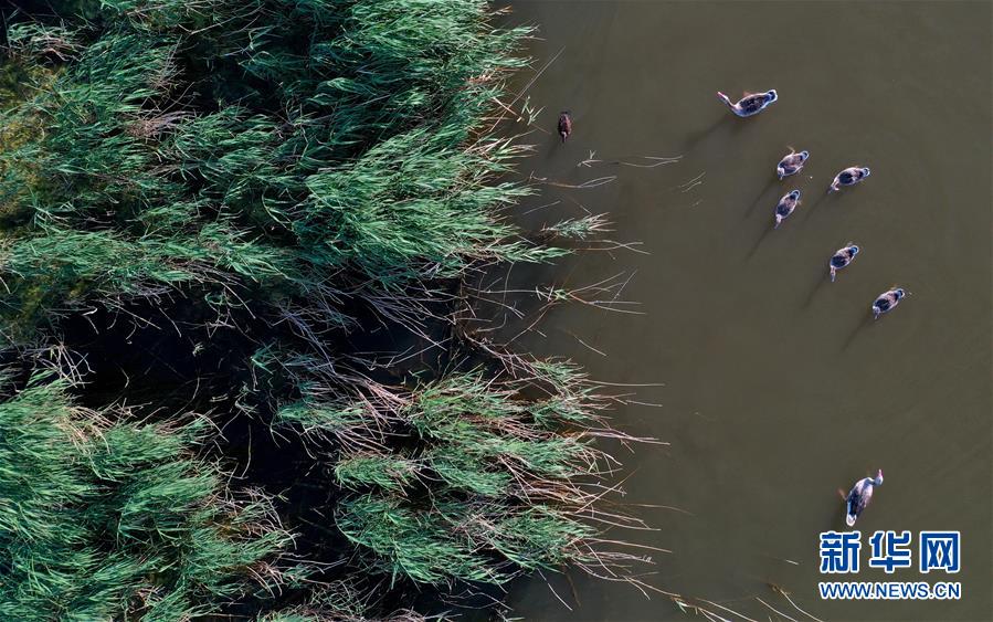 6月19日,一群鴨子在新疆烏倫古湖國家濕地公園覓食(無人機照片)。烏倫古湖國家濕地公園位于新疆阿勒泰地區(qū)福海縣城以西,由烏倫古湖和吉力湖兩部分組成。烏倫古湖濕地公園是遷徙候鳥飛越天山和阿爾泰山的“能量補充站”,良好的濕地生態(tài)吸引著大量遷徙鳥類在此集結(jié)成群,繁殖棲息,成為一道靚麗的風景線。新華社記者 沙達提 攝