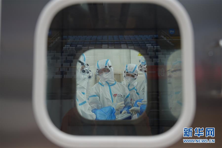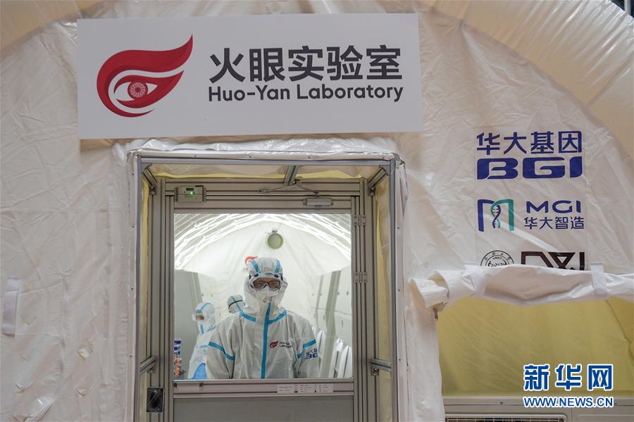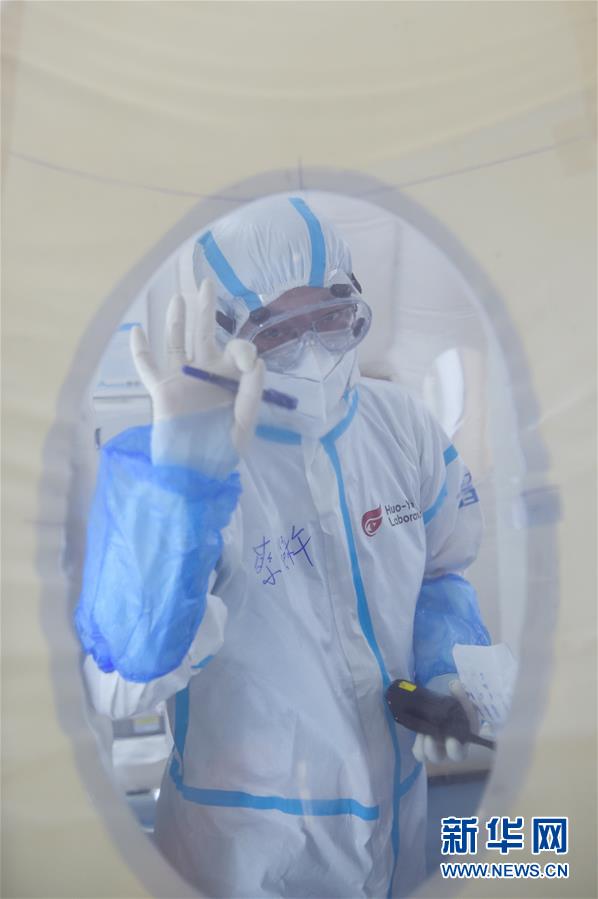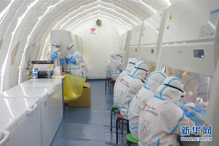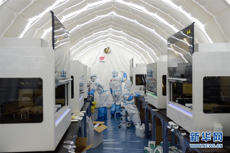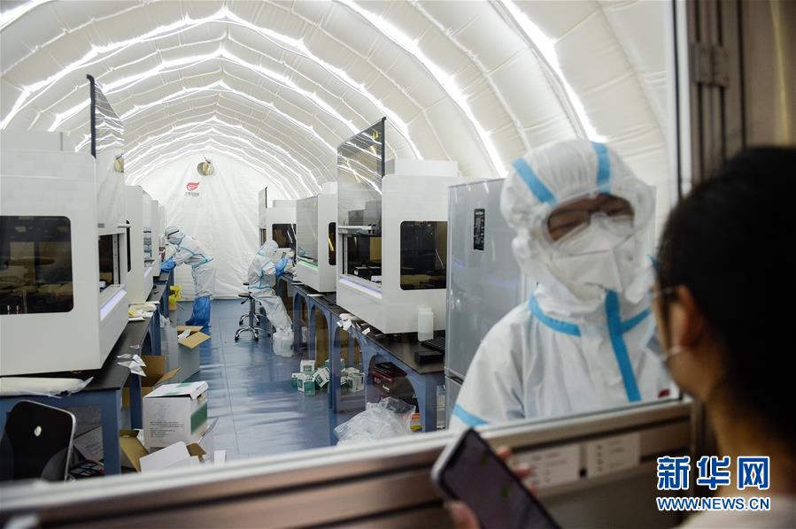 出于北京市疫情防控工作的需要,北京大興區(qū)體育中心綜合館內(nèi)正在搭建一個可移動、自動化、大通量的核酸檢測實(shí)驗(yàn)室。目前,工人們正在緊張地進(jìn)行設(shè)備安裝和調(diào)試。據(jù)介紹,氣膜版“火眼”核酸檢測實(shí)驗(yàn)室6月19日下午開始搭建。兩天多時間基本上完成了設(shè)備安裝和調(diào)試。9個高3.5米、占地70多平方米的拱形白色氣膜艙已搭建完畢,14臺自動化核酸提取設(shè)備準(zhǔn)備就緒。這個北京首座氣膜版“火眼”核酸檢測實(shí)驗(yàn)室正式運(yùn)轉(zhuǎn)后,實(shí)驗(yàn)室核酸檢測能力可達(dá)到每天上萬人份,緩解當(dāng)前核酸檢測壓力。新華社記者彭子洋攝