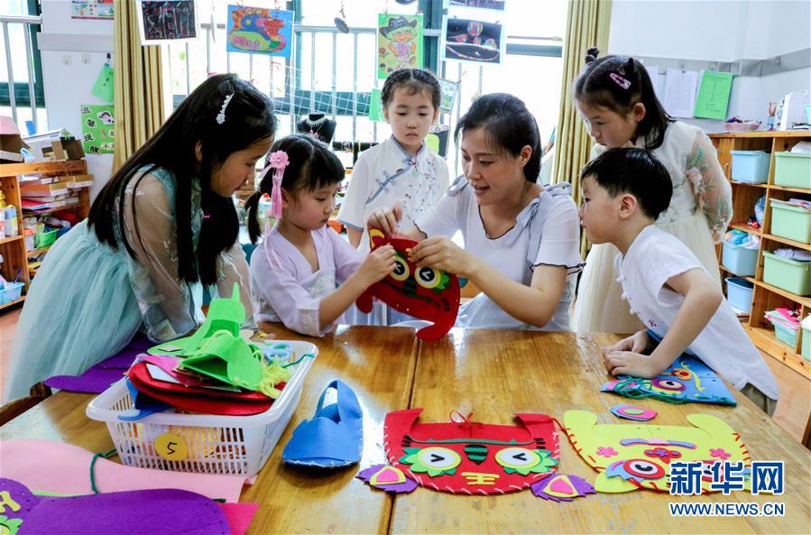 6月23日,長興縣開發(fā)區(qū)實驗幼兒園的孩子們在教師指導(dǎo)下學(xué)做虎頭鞋、虎頭帽。為了迎接即將到來的端午節(jié),浙江省湖州市長興縣各個幼兒園開展“品民俗迎端午”主題活動,讓小朋友們體驗傳統(tǒng)民俗文化。新華社記者徐昱攝