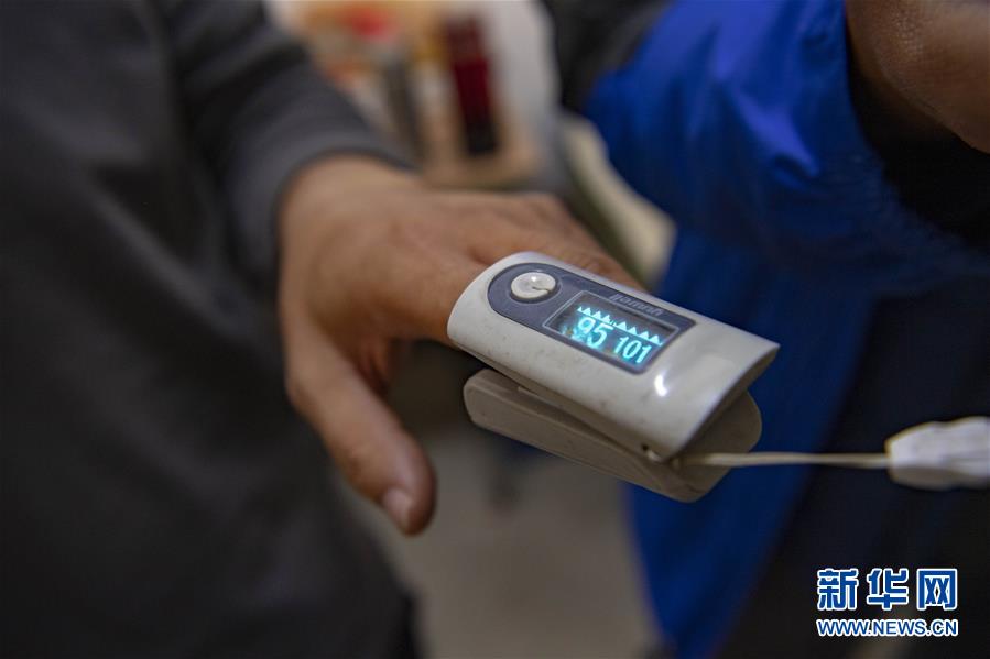 在位于新疆阿克陶縣布倫口鄉(xiāng)蘇巴什村的生活區(qū),天文科技工作者馮國杰用指夾式脈搏血氧儀檢查身體狀態(tài)(6月15日攝)。新華社記者胡虎虎攝